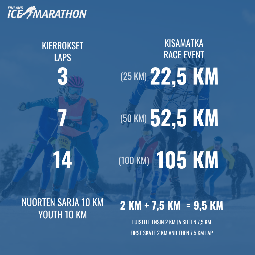 10 km (Nuorten sarjat) | 9,5 km | luistele ensin 2 km ja sitten yksi (1) täysi kierros |